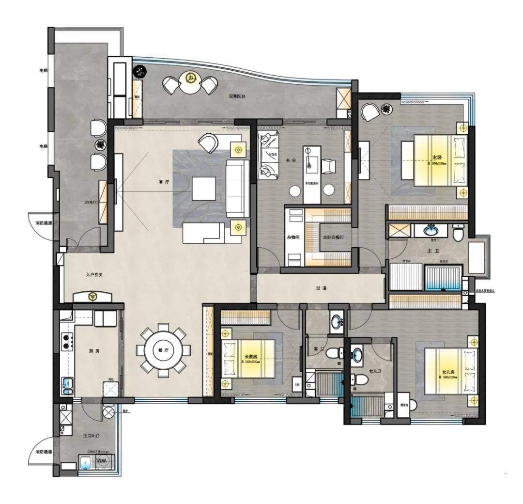 餐邊柜的設計,利于物品的擺放和存取。上方柜體門透明,既能做收納之用,也能作酒柜展示之用。與整體風格相符合的圓形餐桌,再次點名新中式的主題,更表達了傳統文化中對“團圓”的期待。