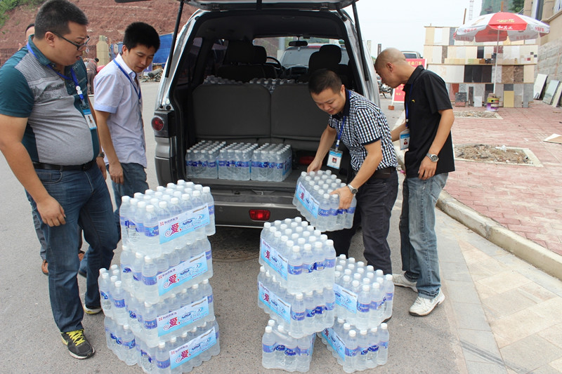 風塵仆仆,慰問成員扛著水向隆鑫天雨方進發(fā)