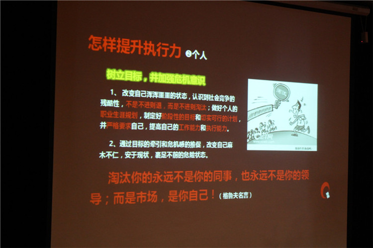 本次培訓會以“贏在執行”為主題,由張總親身授課。會上張總用視頻加案例的形式,詳盡地闡釋了“認識執行力”、“執行力的重要性”、“提升執行力的方法”、“執行力的來源”、“執行力對團隊的作用”及“執行力對個人的影響”等重要內容。為了提升會場氣氛,讓培訓會變得妙趣橫生,培訓會期間,張總與員工們別開生面的問詢,以及邀請部分員工們上臺分享心得,讓整個會場都沉浸在愉快歡悅的氣氛之中,員工們也更加認真積極地聆聽著張總的知識。 在講到“為什么需要執行力”時,張總以戰爭的殘酷性為主題,用八年抗戰中的南京大屠殺為例,講解了只有國家的強大,才能讓我們每個家庭的幸福,親人才不被欺凌,而這一切在國家、民族大義面前,舍小我而成大我的民族氣節及精神,值得我們敬仰;張總繼而轉向團隊發展:“只有強大的執行力,才是實現團隊發展戰略的必要條件。堅守執行,不斷努力,團隊好了,我們也就優秀了,人生就豐富多彩。”會場的家人們響起雷鳴般的掌聲!