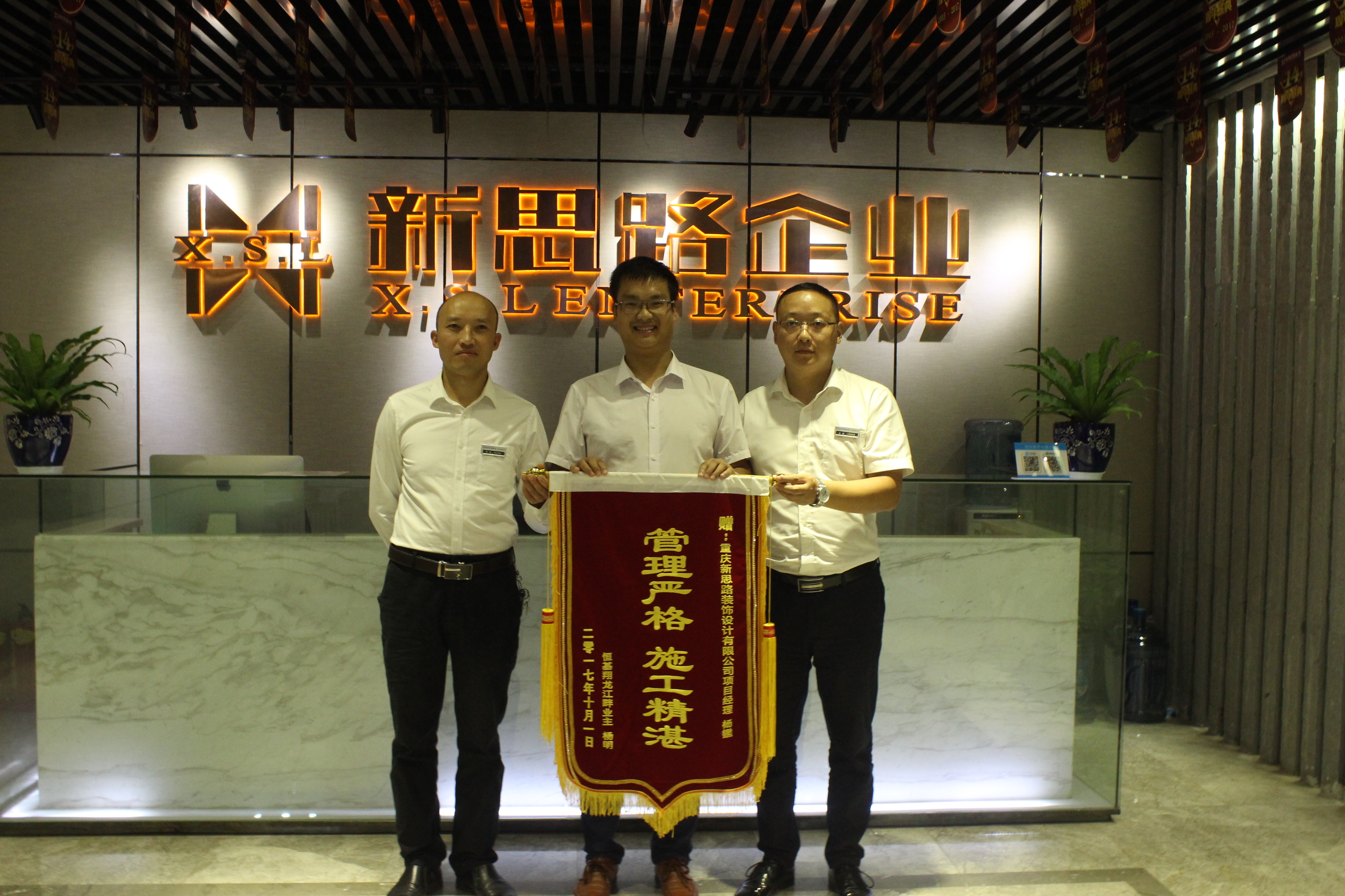 10月9日,來自恒基·翔龍江畔的業(yè)主楊老師將一面印有“管理嚴(yán)格,施工精湛”的大紅錦旗交到工程部文經(jīng)理手中,以感謝新思路裝飾高品質(zhì)的裝修質(zhì)量和管理水平。