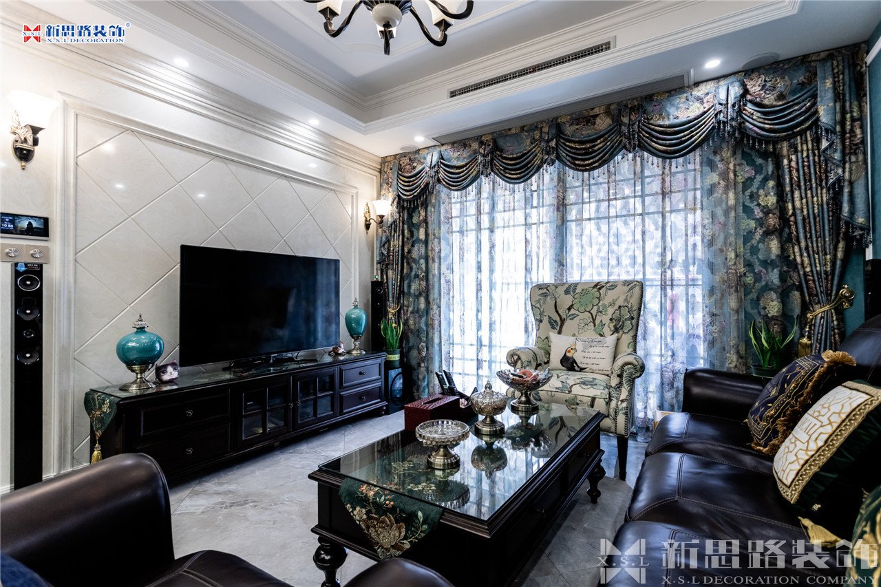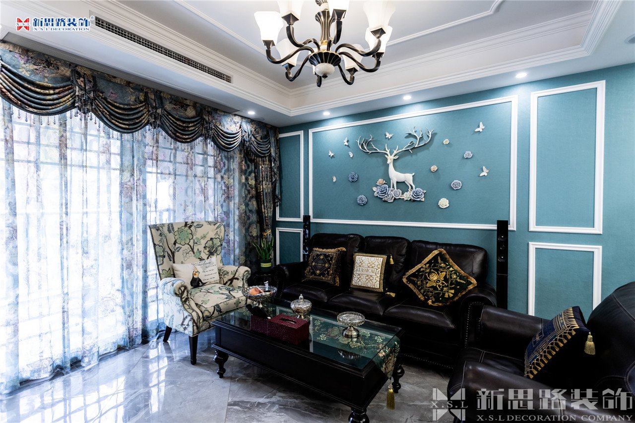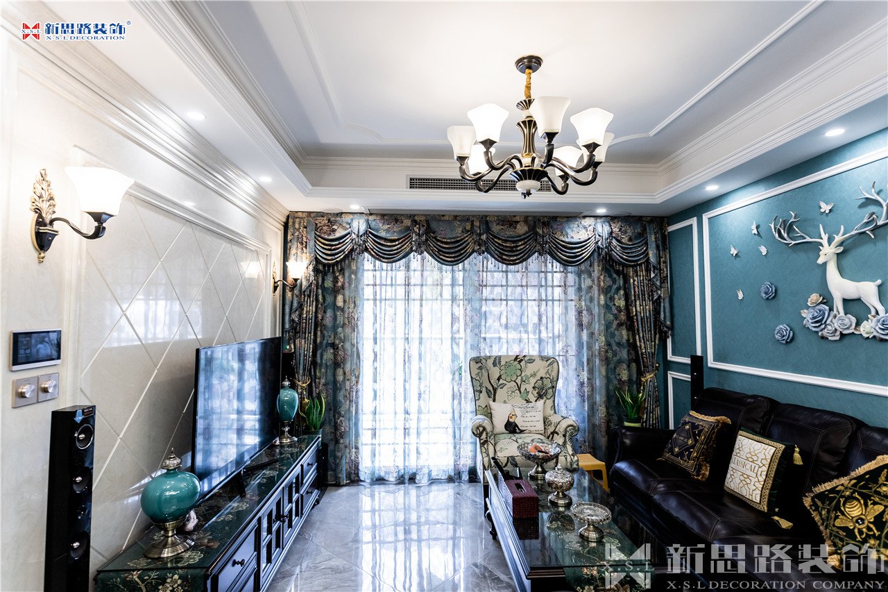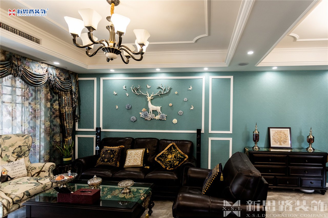 沙發背景墻使用石膏線材勾畫幾何圖形,古典優雅;陶瓷的小鹿漫步花間,野趣橫生。復古花色的窗簾與真皮質地的沙發以及實木電視柜搭配起來正合適,線條分割成菱形網格狀的乳白色電視背景墻大方低調,黃銅色美式吊燈干凈明亮。深墨綠色的織錦桌旗無形中又添了點奢華意味,油青色的仿古裝飾擺件也是非常經典的美式元素體現。