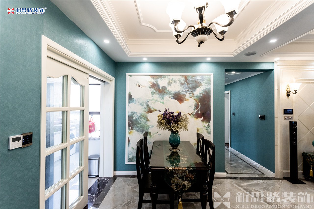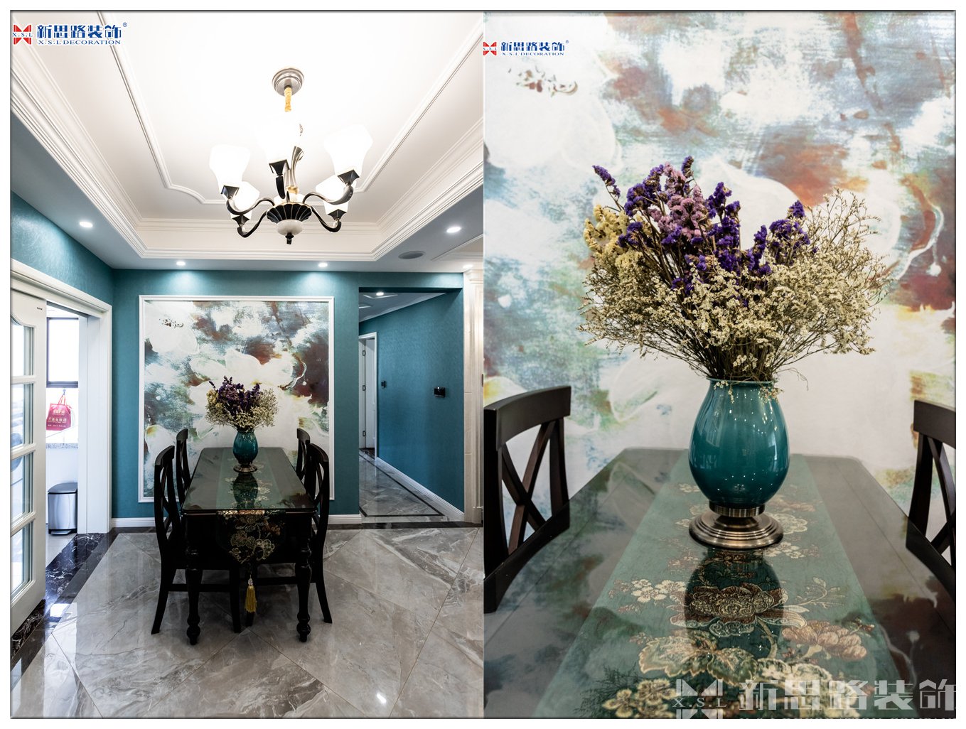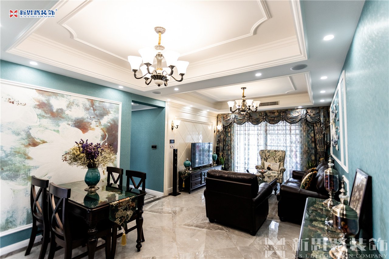 沙發背景墻使用石膏線材勾畫幾何圖形,古典優雅;陶瓷的小鹿漫步花間,野趣橫生。復古花色的窗簾與真皮質地的沙發以及實木電視柜搭配起來正合適,線條分割成菱形網格狀的乳白色電視背景墻大方低調,黃銅色美式吊燈干凈明亮。深墨綠色的織錦桌旗無形中又添了點奢華意味,油青色的仿古裝飾擺件也是非常經典的美式元素體現。
