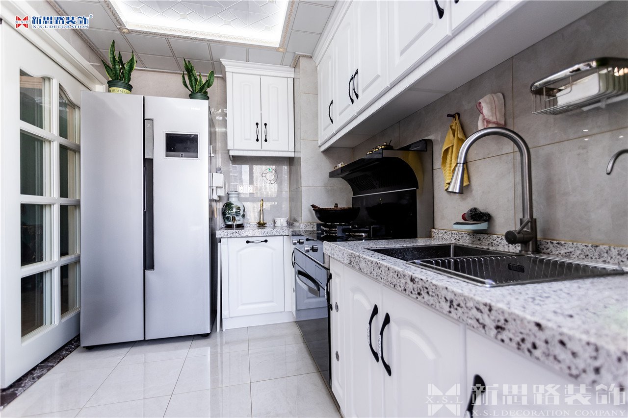 廚房灶臺使用白色大理石材質打造,料理臺的設計更方便食物的制作。櫥柜顏色也選取了同色系的白色,清新干凈,讓本是油煙滿滿的廚房視覺上看起來明亮整潔。