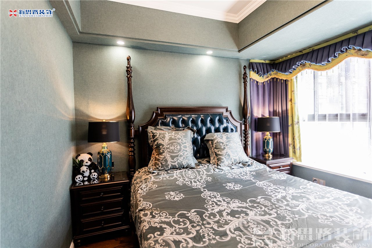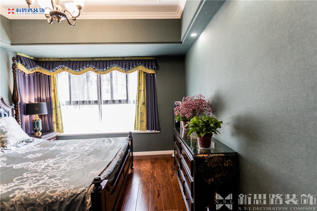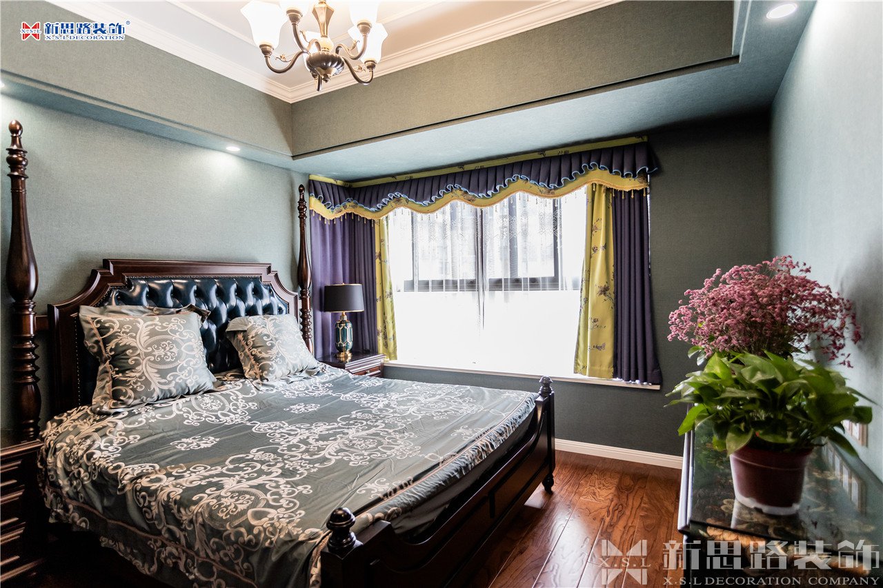深色木質家具與復古風的裝飾正是美式裝修風格的亮點之一,深青色的皮質床頭與墻面色系相統一。衛生間的浴缸設計非常適合休息之時放松泡澡,桌子上的上永生花與盆栽點綴房間,生機勃勃。