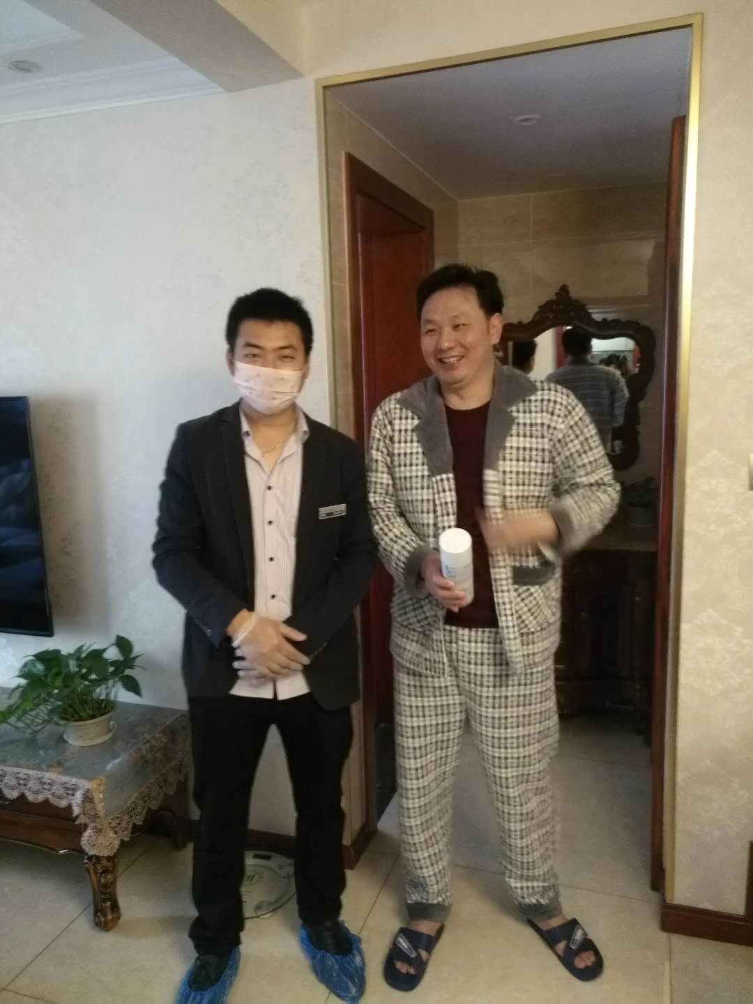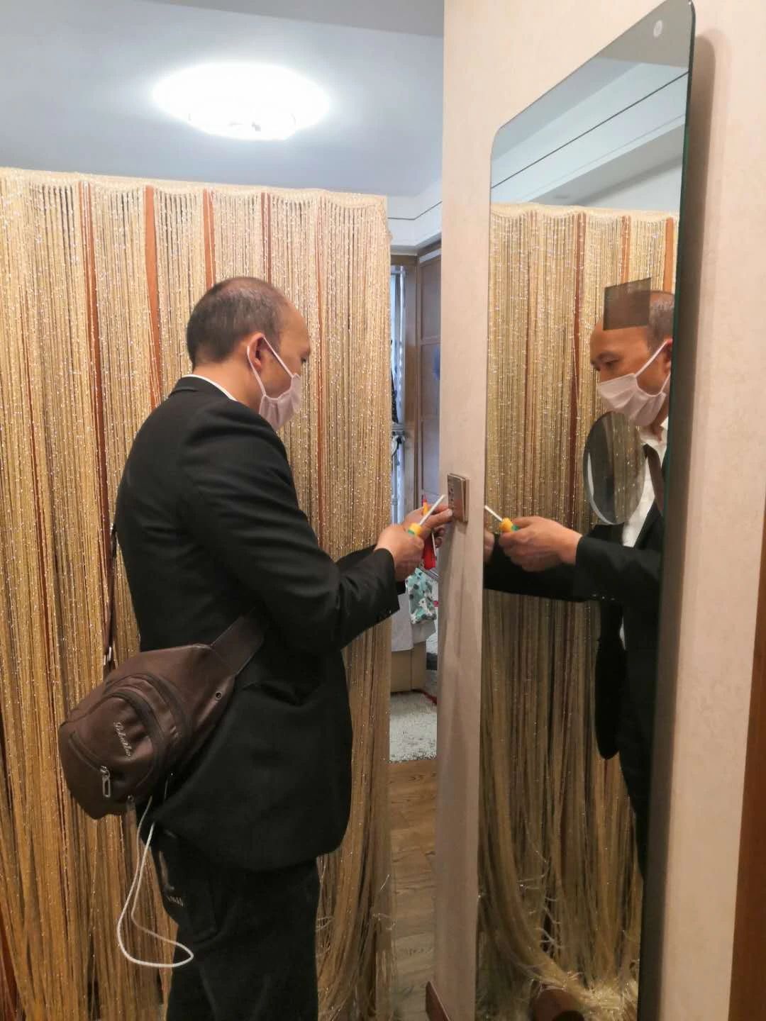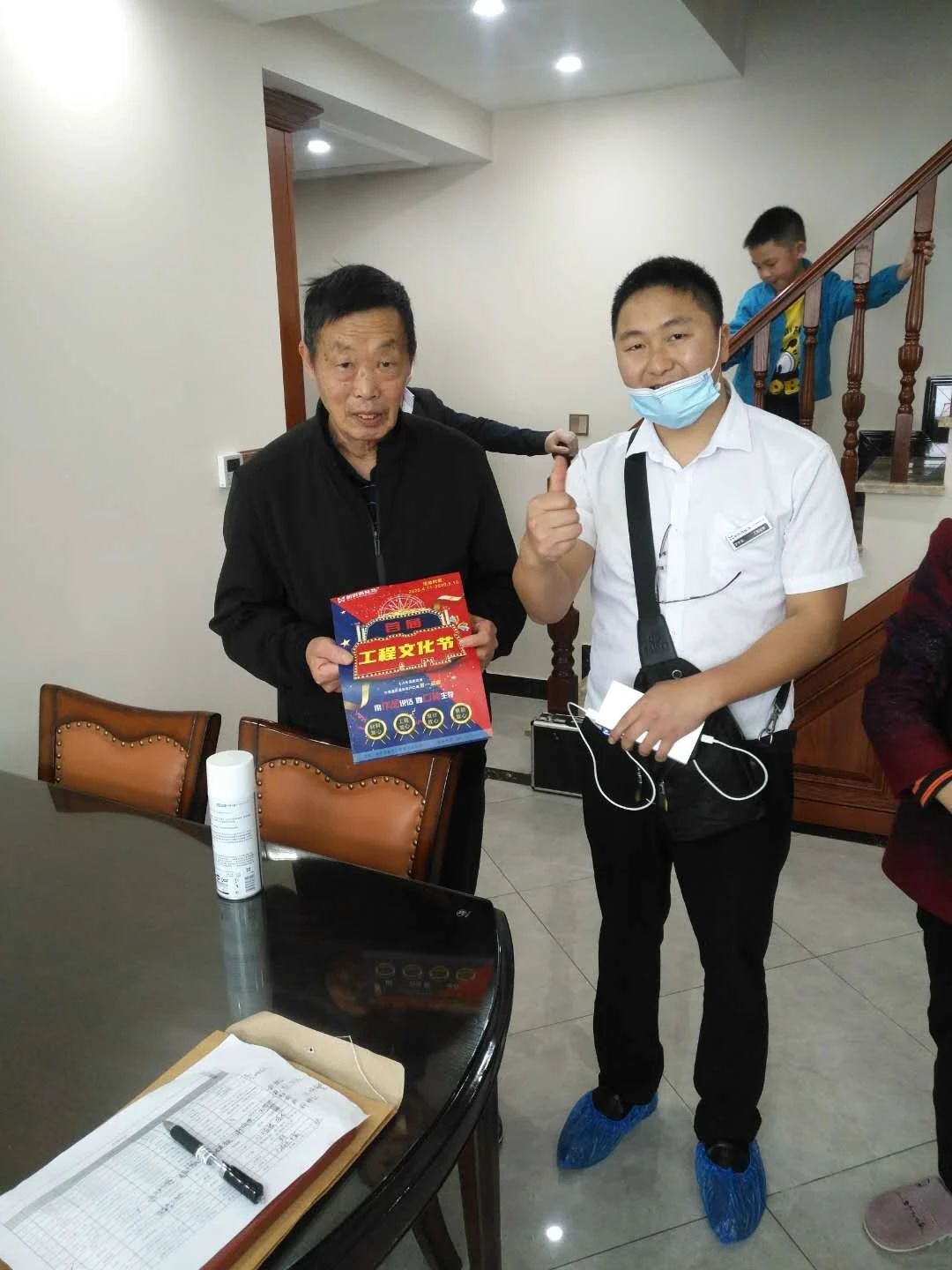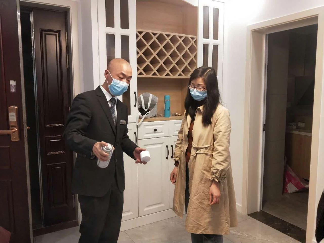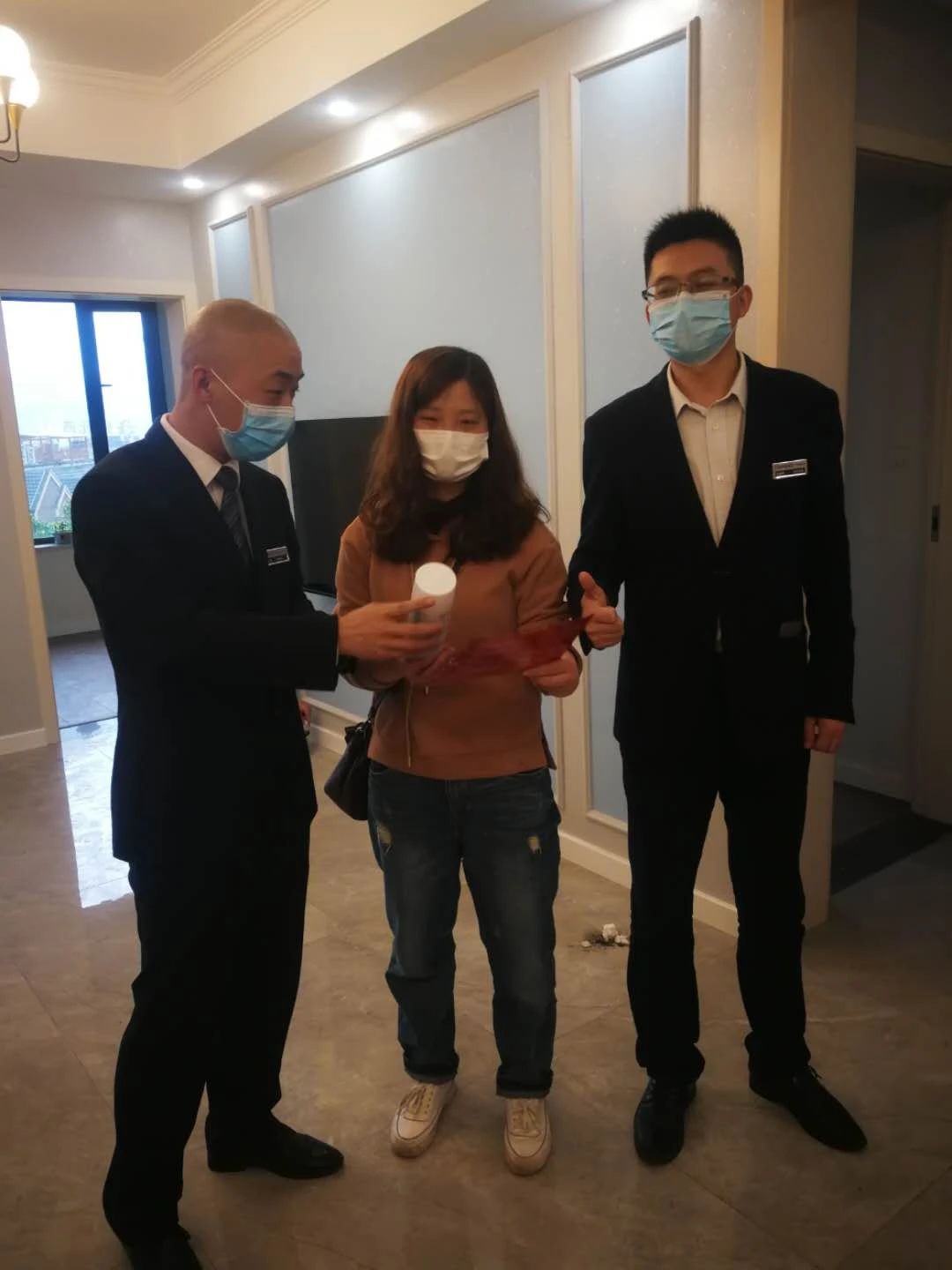 ▲工程部回訪專員為業(yè)主贈(zèng)送酒精消毒液