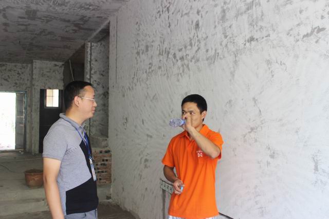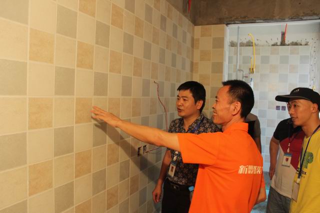 工人師傅在向張總及慰問小組一行匯報(bào)自己貼磚工藝及工作情況
