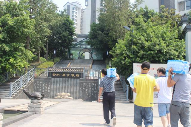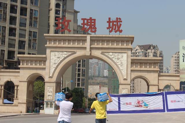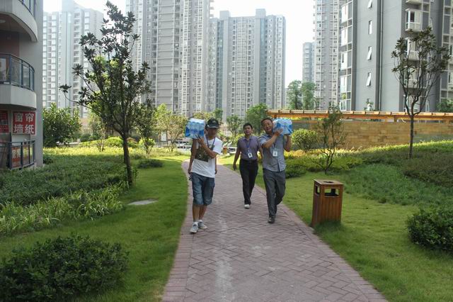 張總及慰問小組一行扛起水向東方雅郡小區(qū)施工工地進(jìn)發(fā)送水