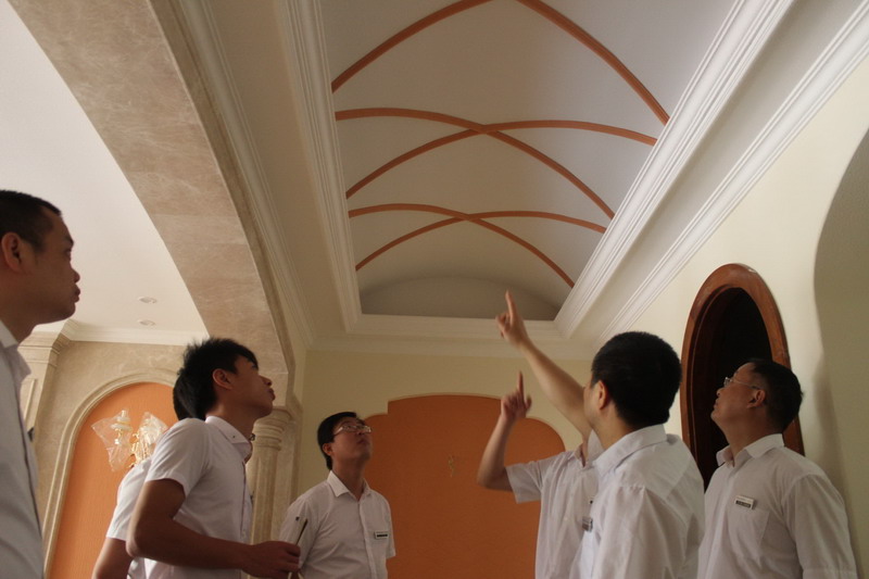 在雅居樂39-2工地。該別墅設(shè)計(jì)師——南坪店楊店長(zhǎng)向大家詳細(xì)講解了電視墻、頂面造型的設(shè)計(jì)技巧以及相關(guān)材料的使用等知識(shí)。大家也依據(jù)自身所學(xué)和相關(guān)施工經(jīng)驗(yàn),大膽提出自己的設(shè)計(jì)見解。工地大巡查不光確保了工程品質(zhì),同樣也拓寬了設(shè)計(jì)視野,為提升各店設(shè)計(jì)實(shí)力打下了堅(jiān)實(shí)的基礎(chǔ)。