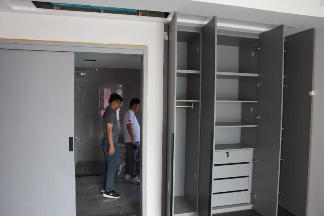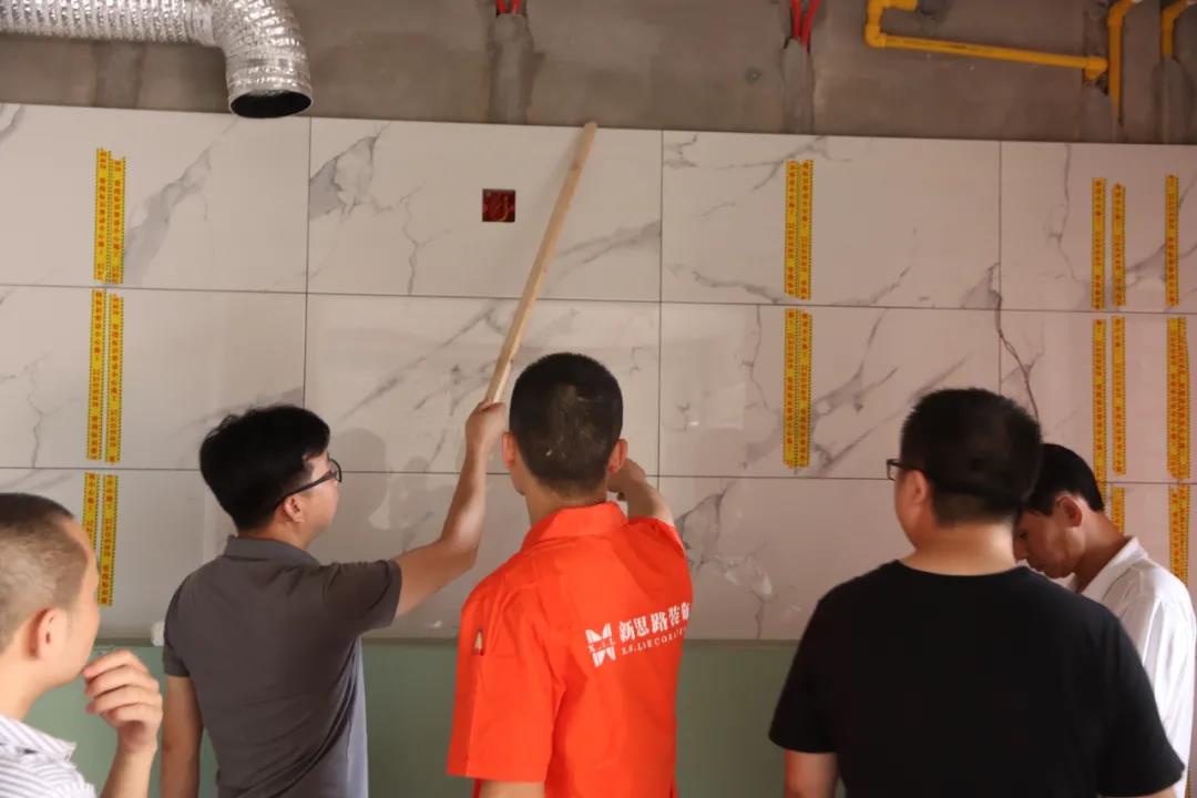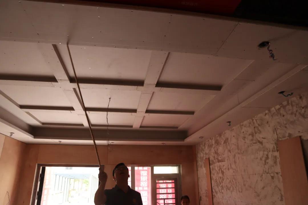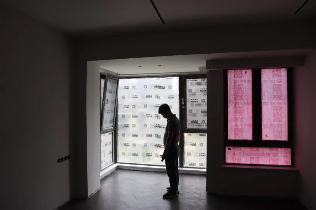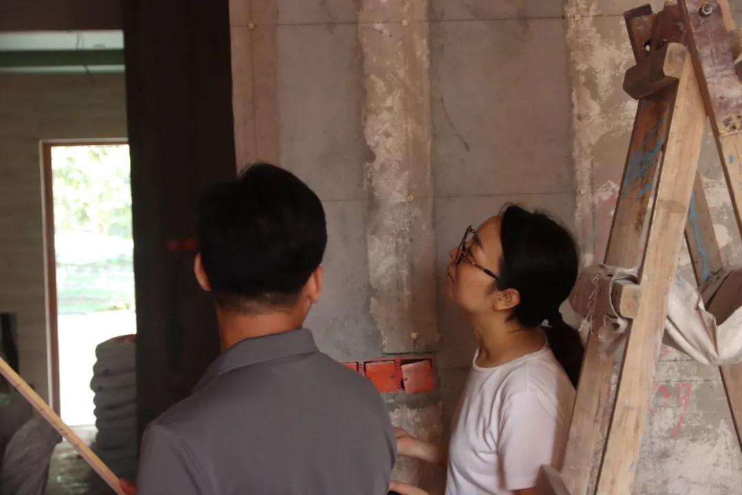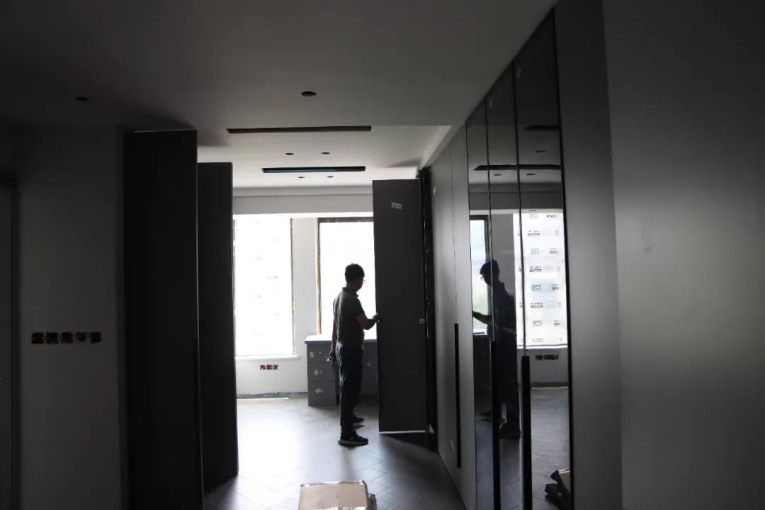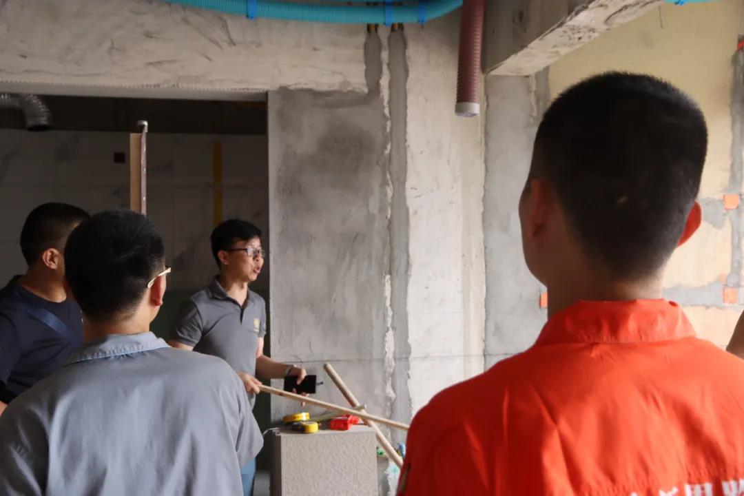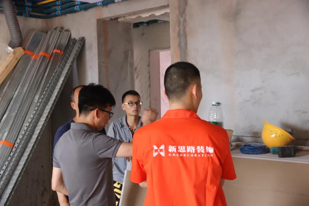 我們來到的第一處工地是水電階段剛結束、正在進行硬裝階段的工地。客戶正在工地上查看情況,設計師敖元壩剛到現場,就和我們在施工的工人以及在場的客戶交流起來。