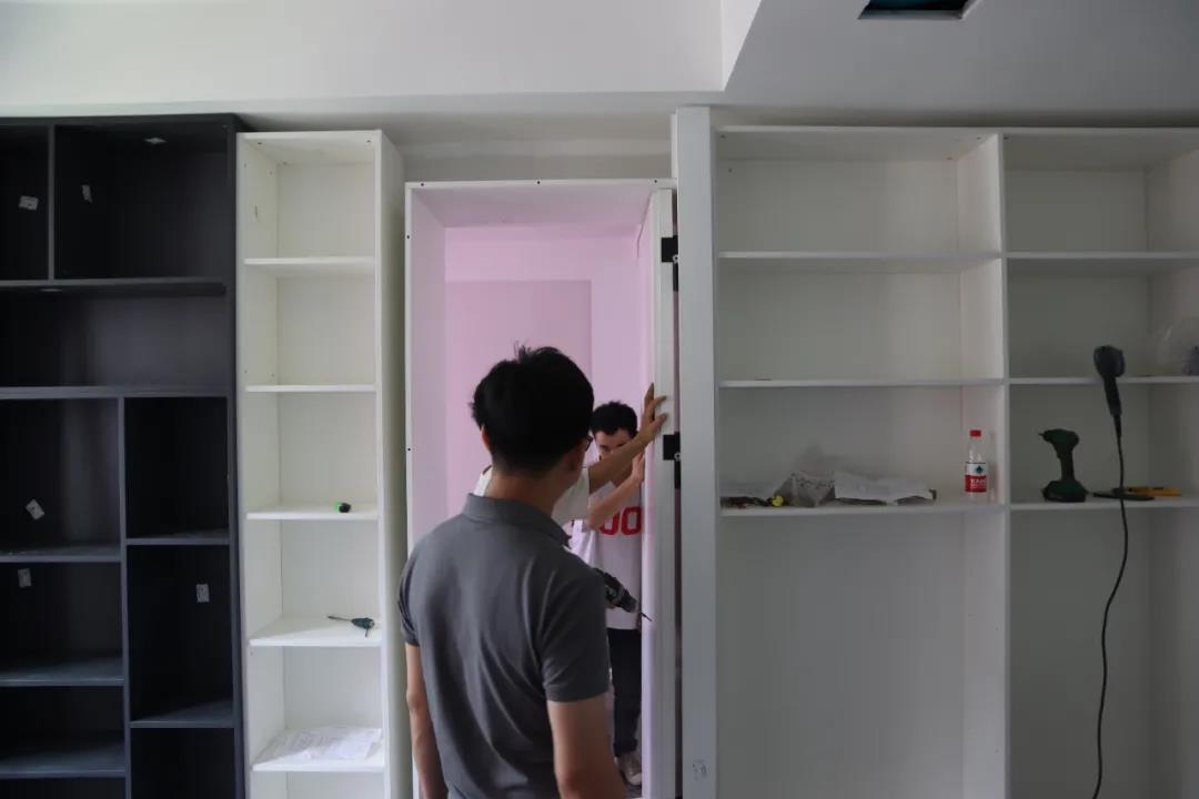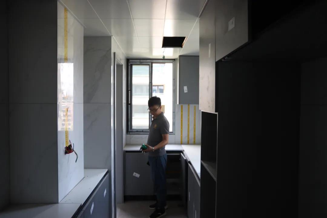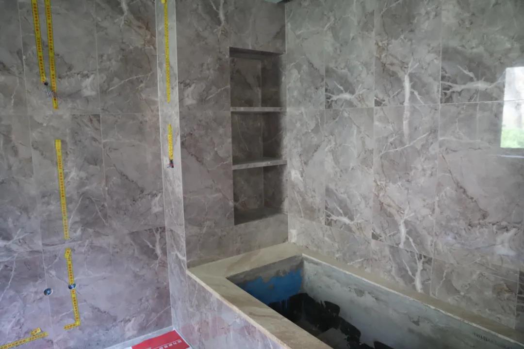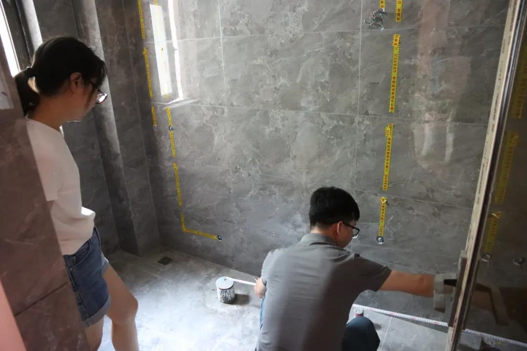 衛生間瓷磚拼貼完成后,接下來就要準備上馬桶、臺盆、柜子等的安裝。衛生間空間有限,各個物品的尺寸需要復核多遍,保證最后在安裝的時候能夠正好符合。為此,設計師敖元壩和業主再次對衛生間的一些尺寸進行了測量。