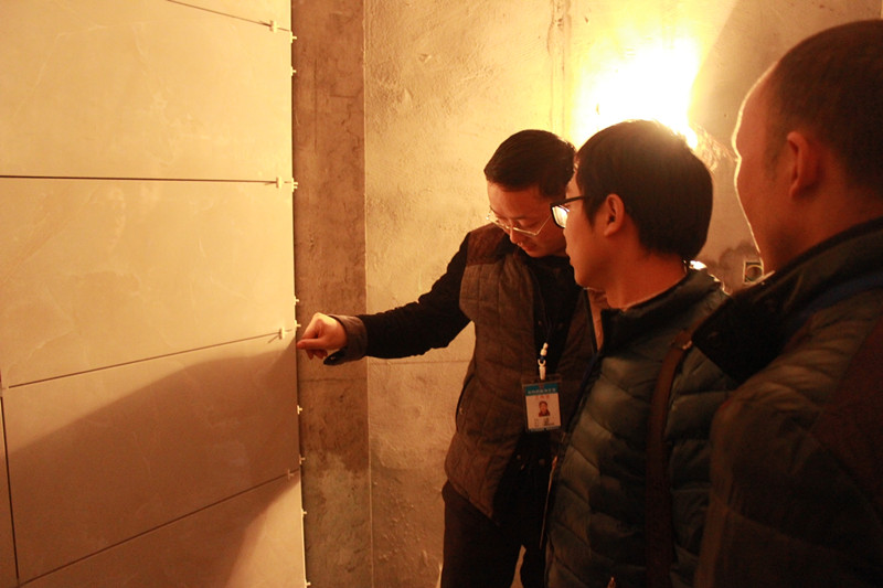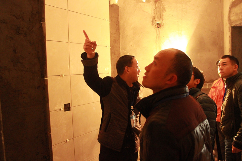 工程部文經理正在向巡查小組成員講解墻面貼磚工藝要點