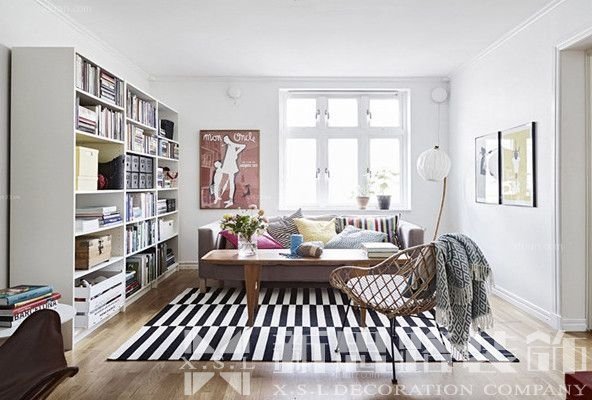 黑白兩色的搭配是配色中最常用的,同時也是北歐風格中經(jīng)常會使用到的顏色。以上面北歐風格沙發(fā)、一個藤條的躺椅使整個房間氣氛看起來輕松、自由,十分簡單的桌子設計和純白色家具的書架以及一個白色造型優(yōu)美的臺燈,讓人感覺整潔明亮。其中最亮眼的就當屬北歐客廳地毯的鋪設,黑白條紋給人視覺上的交錯感,光看就感覺踩上去會很舒服,同時帶點小時尚感。