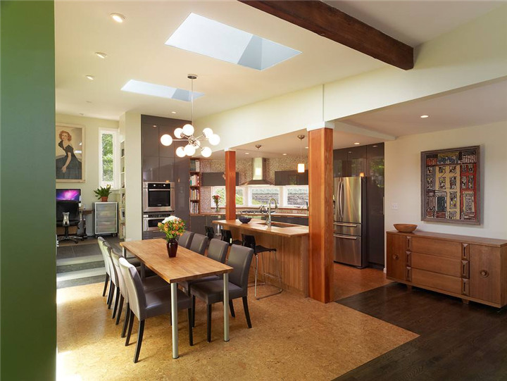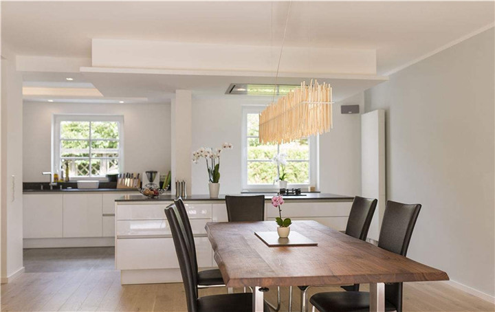 開放式廚房是指巧妙利用空間,將實用美觀的餐桌與廚房緊密相連,形成一個開放式的烹飪就餐空間.開放式廚房營造出溫馨的就餐環境,讓居家生活的貼心快樂從清早開始就伴隨全家人。中等戶型的家庭會根據空間的特點來放置各種結構的櫥柜,無論是島型操作區,或是L型操作區、方正空間常用的U型操作區、具備分隔空間功能的T型操作區,都能毫不費力地開辟出擺放餐桌的位置。